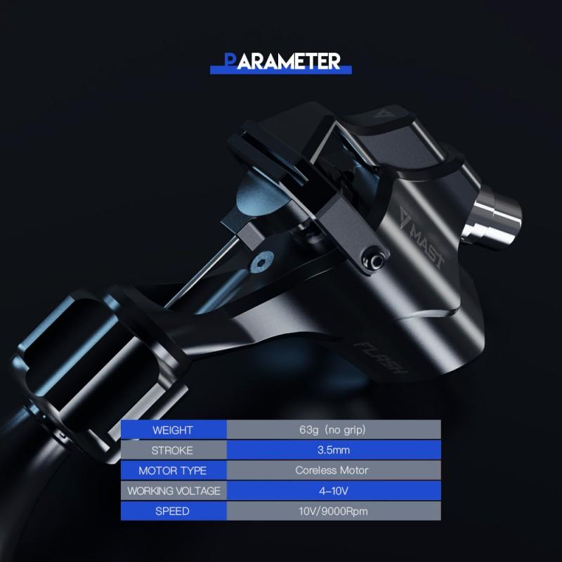 - Med en nålebevægelse på 3,5 mm er Mast Flash velegnet til alle former for tatovering, hvilket sikrer alsidighed og præcision.