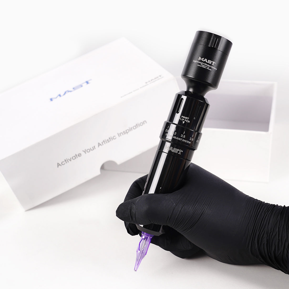 Mast Filp is one new designed machine that with six-stroke length options 2.6mm,2.9mm,3.2mm,3.5mm,3.8mm, and 4.0mm for a wide variety of procedures, suit for all kinds of tattoo style lining, shading, color packing. The Internal structure of the machine allows artists to keep the Flip Pen bagged while making stroke length adjustments, ensuring uninterrupted and seamless tattooing.