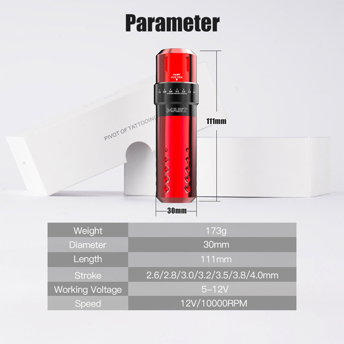 A Mast Flip egy újonnan tervezett gép hét ütemű hossz opciókkal 2,6 mm, 2,8 mm, 3,0 mm, 3,2 mm, 3,5 mm, 3,8 mm és 4,0 mm a legkülönfélébb eljárásokhoz, mindenféle tetoválás stílusú béléshez, árnyékoláshoz és színpakoláshoz. A gép belső felépítése lehetővé teszi a művészek számára, hogy a Flip Pen-t táskában tartsák, miközben beállítják a vonáshosszt, biztosítva a megszakítás nélküli és zökkenőmentes tetoválást.