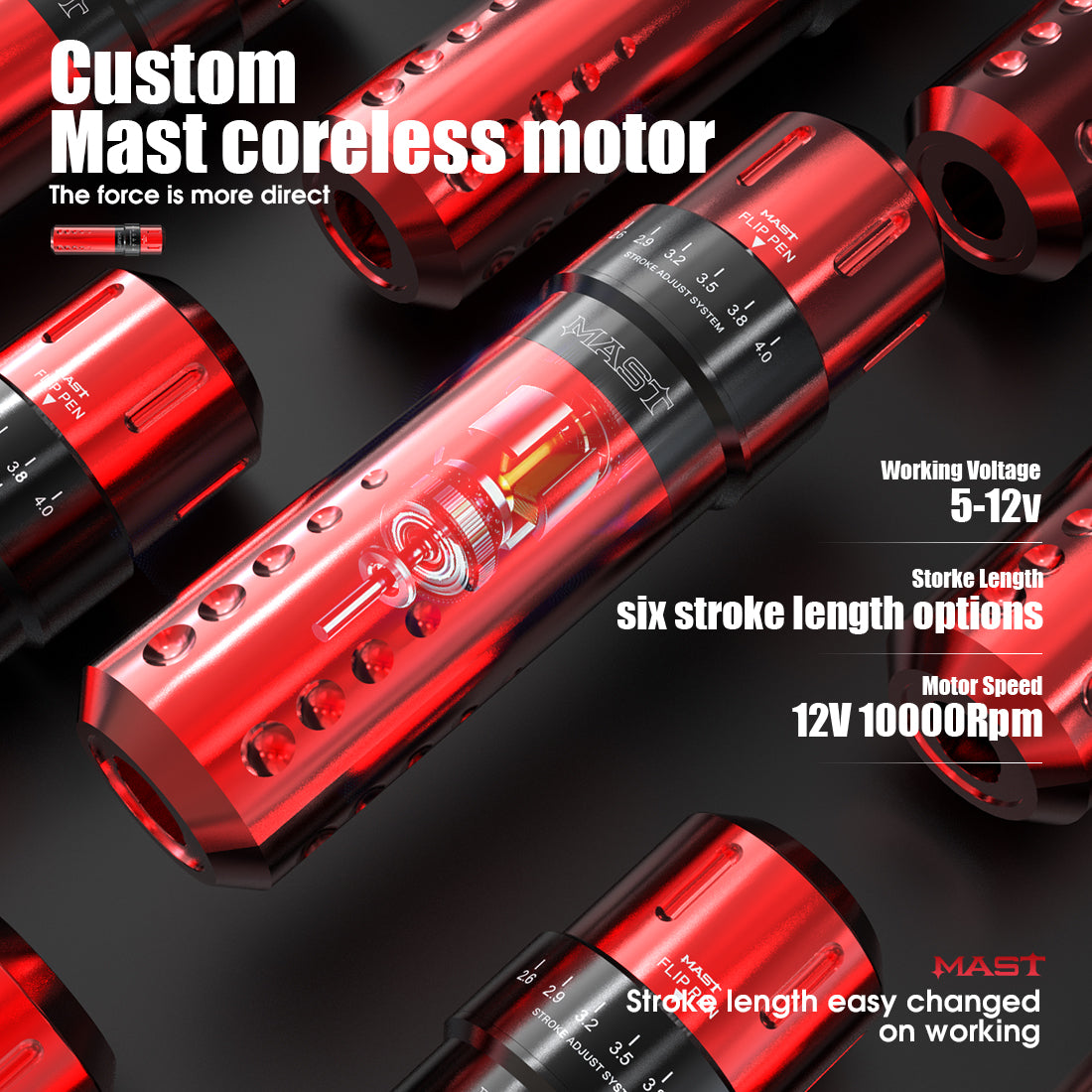 Mast Filp è una macchina di nuova concezione con sei opzioni di lunghezza del tratto 2,6 mm, 2,9 mm, 3,2 mm, 3,5 mm, 3,8 mm e 4,0 mm per un'ampia varietà di procedure, adatta a tutti i tipi di stile di tatuaggio, di rivestimento, di ombreggiatura e di riempimento del colore. La struttura interna della macchina consente agli artisti di tenere la Flip Pen insacchettata mentre effettuano le regolazioni della lunghezza del tratto, garantendo un tatuaggio ininterrotto e senza interruzioni.