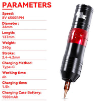 - Arenahawk Amor 2.4-4.2 Stroke Tattoo Pen met Batterij voor Beginners met 6 Verwisselbare Stroken. Deze tattoo pen met batterij is een hoogwaardig en gebruiksvriendelijk product, ontworpen voor beginners. Hij maakt gebruik van geavanceerde 2.4-4.2 Stroke technologie voor nauwkeurigere en meer gevarieerde tatoeage-effecten. Bovendien is deze pen met batterij uitgerust met een verwisselbaar strekensysteem waarmee gebruikers de streken van de punt eenvoudig naar wens kunnen aanpassen.